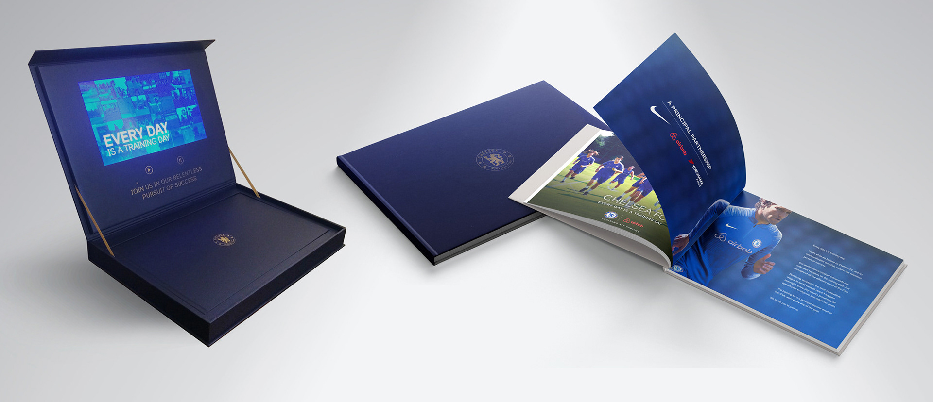 Around 150 tailored versions were produced, each customised for major brands across a wide range of industries. The final piece used textured materials, gold-foiled Chelsea crests, and integrated video buttons to create a premium, high-impact presentation.