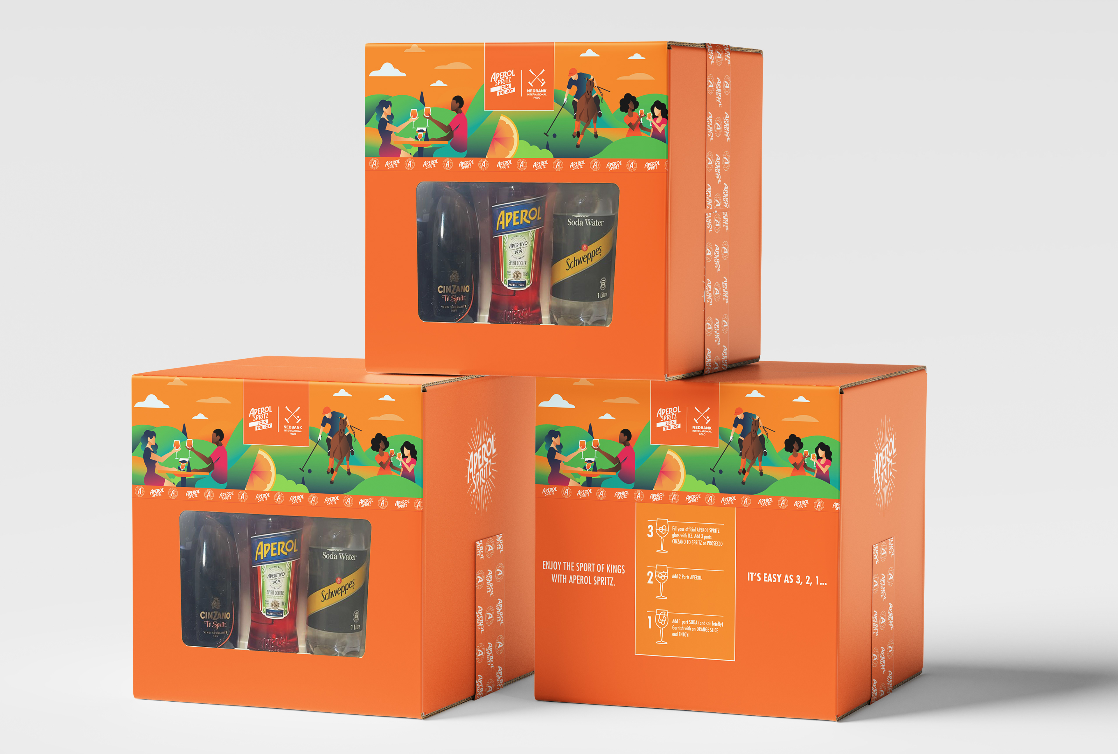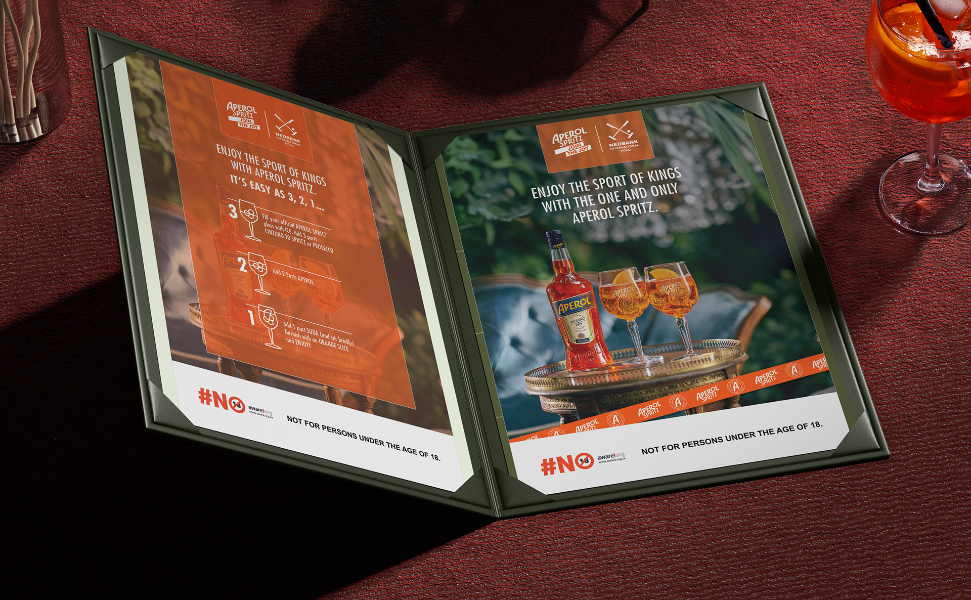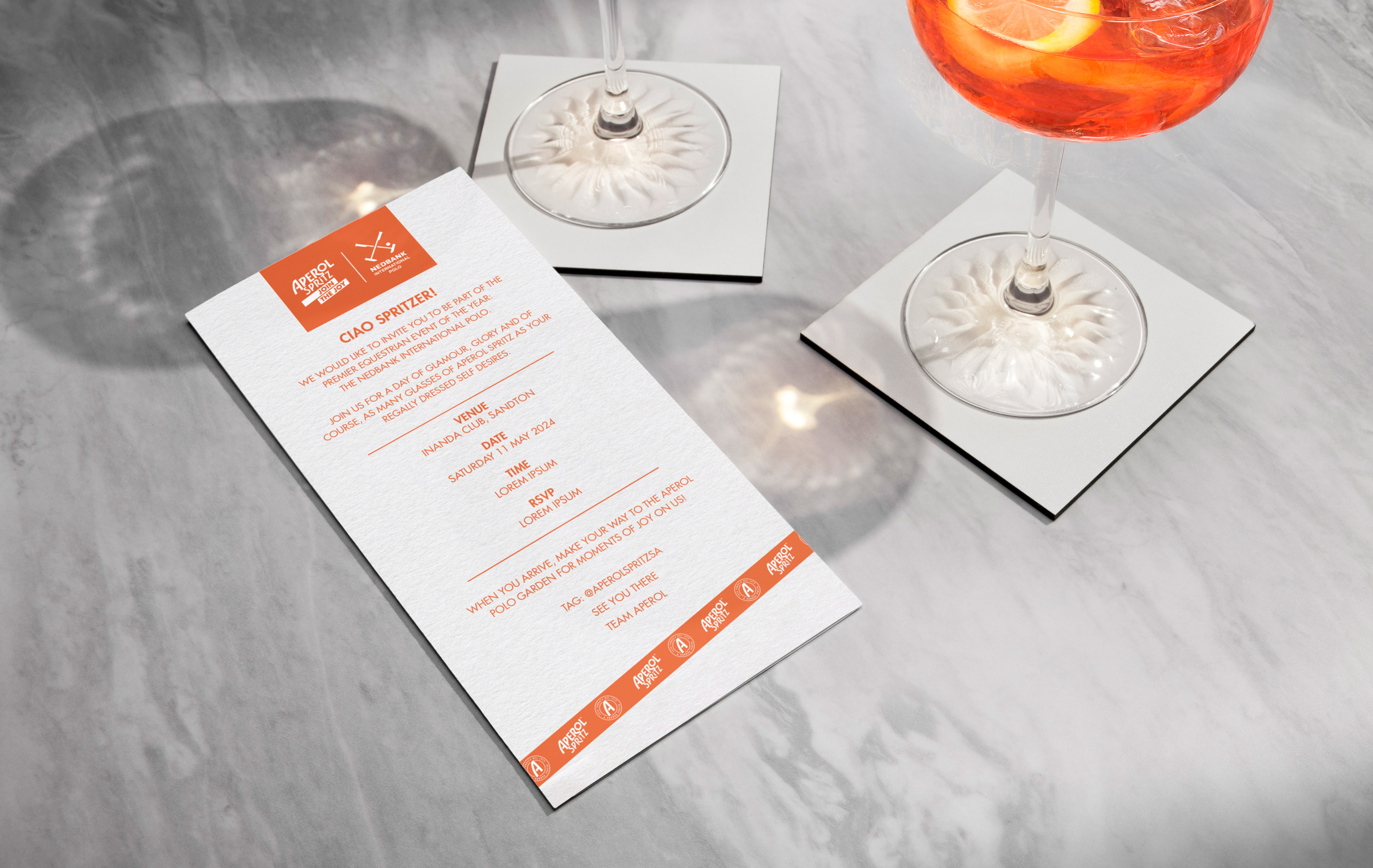 In 2024, Aperol partnered with the Nedbank International Polo to create a vibrant lifestyle event blending sport, fashion and culture. I led the design for the campaign across digital and print. I created a custom, polo-inspired Aperol ribbon motif using the Aperol crest and logo, bringing Aperol’s bold, playful brand language into the polo setting and running as a graphic thread throughout the work.